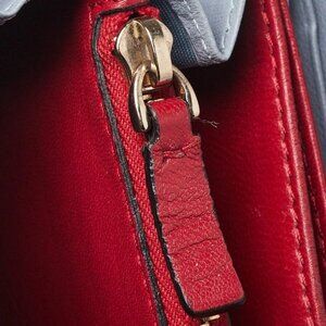 The exterior leather is clean and beautiful but has creasing throughout and a few marks. The zipper panel shows rubbing and light wear. The hardware has scratches and some fading. The interior card slots are slightly stretched and the leather has scuffing and a light scent. Overall the wallet is clean and in good, gently used condition.