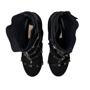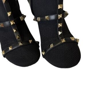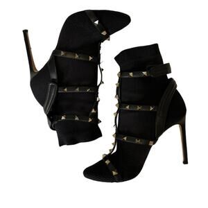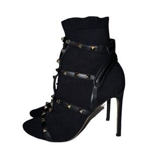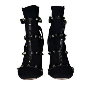 These Valentino's feature stretchy knit uppers, sock like silhouette, gold rock stud hardware, caged design, approximately 4 inch stiletto heel, leather trim, velcro closures, and an easy slip on design. These ankle boots show some signs of wear such as scuffs on soles and scuffs on heels. Other then that they are in excellent condition. Measurements in photos are for estimates only.