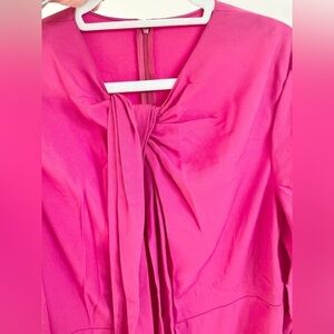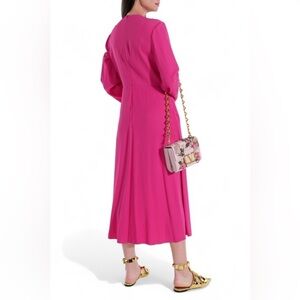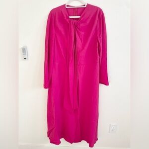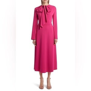 This free-flowing A-line midi dress in supple matte cady charms with its floppy bow neck, long bell sleeves and luscious pink hue.
