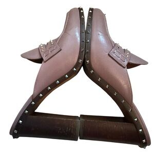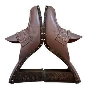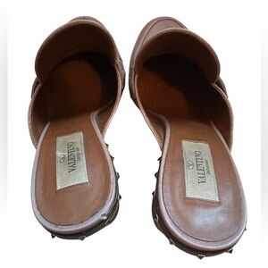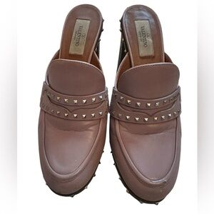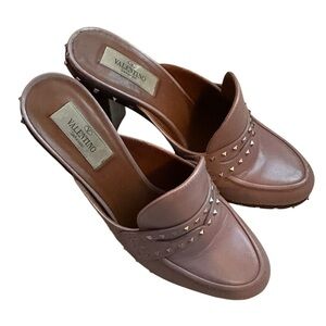 These Valentino mules feature a sophisticated brown leather design adorned with decorative silver studs across the vamp. The backless style ensures easy wear, making them perfect for both casual and semi-formal occasions.