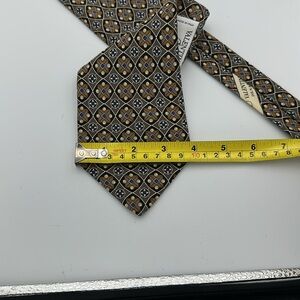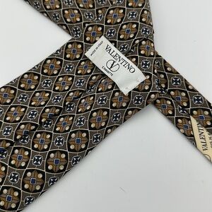 Stylish tie with intricate geometric design. Features brown, blue, and cream tones. Ideal for formal wear.