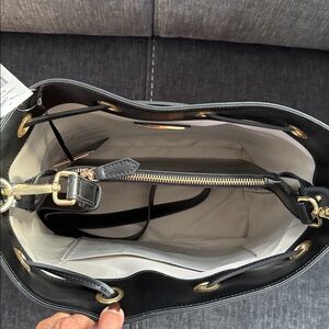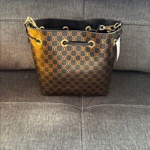 Stylish bucket bag with monogram pattern. Features gold accents and drawstring closure.
