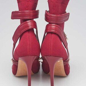 These fabulous and trendy boots from Valentino were designed with a sock-like fit. The features tonal burgundy calfskin straps and are adorned with polished goldtone pyramid studs. These boots could not be more desirable!