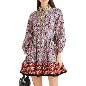 Valentino Colorblock Floral Pleated Shirt Dress Red Yellow Purple Collared IT 42