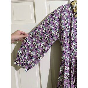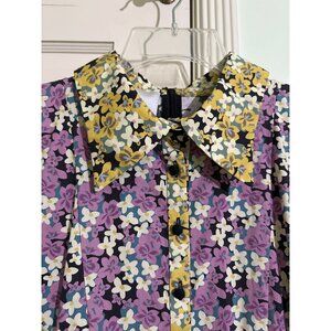 This Valentino Pleated Shirt Dress is in great condition! Features a colorblock floral print (red, yellow, purple). Cotton, hits above knee length, long sleeves, collared, shirt dress style.