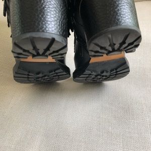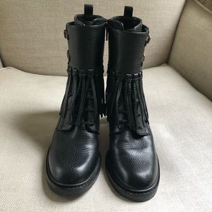 Valentino Fringe Combat Boots. Beautifully crafted in black pebbled leather, and accented w knotted fringe details and gold toned buckles. The chunky heel completes the look. An edgy Valentino Combat boot, perfect w a dress or skinny jeans.