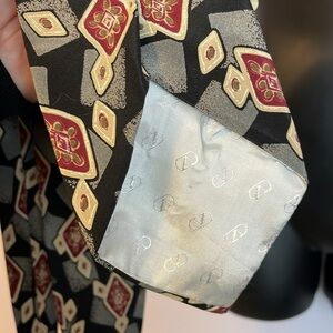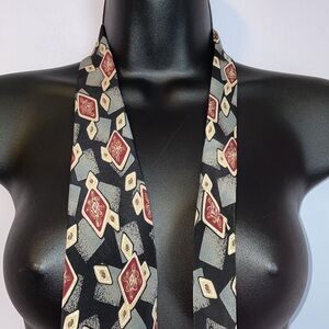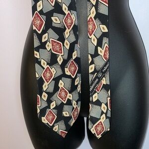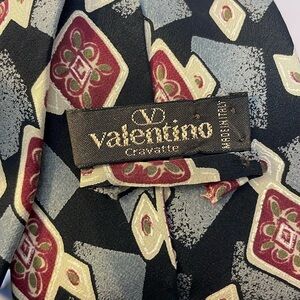 Valentino Cravatte Silk Diamond Square Geometric Design Necktie Tie Gray Black Maroon Cream colors. Good preowned condition. Stitch on back small part loose only flaw. Colors go with a lot of different things. Designer.