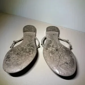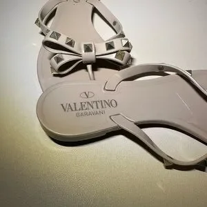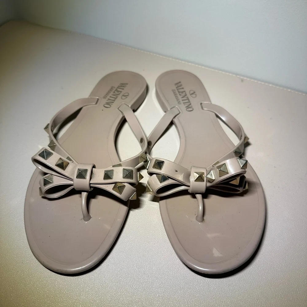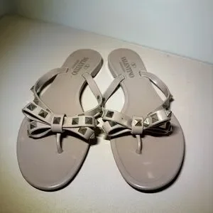 These Valentino sandals in a sophisticated cream color feature elegant bow details on the straps, adding a touch of charm to their casual design. Perfect for warm weather, these flat sandals offer a simple thong-style fit, ideal for beach outings or leisurely strolls. Crafted with a focus on style and comfort, they are a must-have addition to your summer wardrobe.