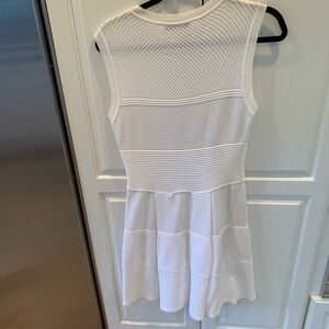 Sporty white Valentino spa dress. Size is not marked, but I am thinking it is a size medium? Lots of stretch. Beautiful lace detail to neck. Un-Lined dress. Beautiful box pleats in the skirt. Good condition. Scant amount of make up to neck line. Please see photos. Smoke free home.