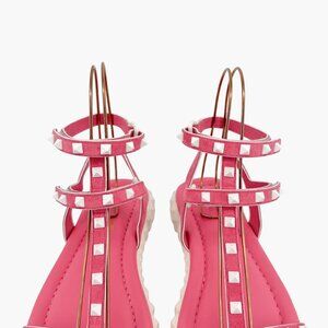 These Valentino Garavani Free Rockstud gladiator sandals feature pink suede straps with signature stud hardware and a T-strap silhouette. Designed for statement styling with lightweight wearability, they add standout appeal to warm-weather looks from dresses to tailored shorts.