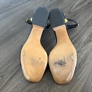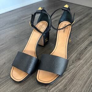 Valentino Garavani Black Leather Gold Studded Sandals 41 Grained Block Heels