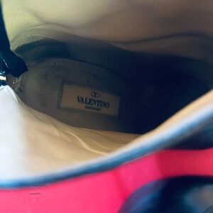 These stunning black ankle boots by Valentino Garavani feature a sleek leather finish and a striking line of gold-colored studs along the side. The high stiletto heel adds a touch of elegance, making them perfect for a fashionable statement. Valentino Garavani Black Leather Ankle Boots Front Rockstud Size: 38IT or 8 US. Black Calf Leather. Front Line with Rockstud Detail. 0.75" Platform covered by leather as an invisible part of boots. Heel Size with no platform is 4" (100 mm), with platform is 4.75". Approximate length of boots is about 5.5" inclusive platform height. Back Zipper. Great condition. Please note the right side heel has a small dent that was repaired in the shoe repair store to achieve smeller visibility as shown on the last picture. The soles of boots were professionally painted.