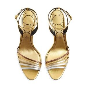 Brand new with box and dustbags Valentino Garavani Ladycrush Metallic Crystal Embellished Ankle Strap Heel size 41.5 Step into luxury with the iconic Valentino Garavani "Ladycrush" sandals, a true statement piece that promises to be the focal point of any ensemble. Crafted in Italy from exquisite laminated nappa leather, these heels feature multihued metallic (gold, silver, and bronze) strappy details set at a chic diagonal slant over an open toe.