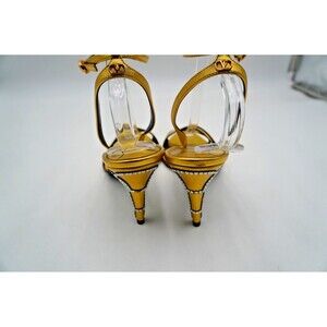 The showstopper of this design is the high stiletto heel adorned with glittering crystals and a subtle scallop pattern detail. A delicate, adjustable ankle strap with a buckle closure ensures a secure fit, while a custom leather insole with a scallop motif adds a signature touch of designer detail.