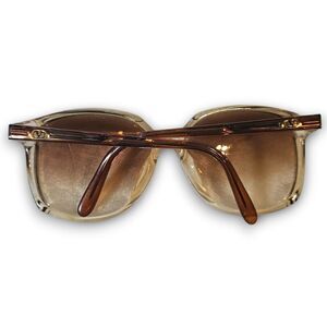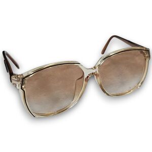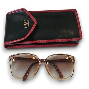 Details: Vintage 1980s glam Valentino Garavani oversized sunglasses with a translucent gold frame and brown gradient. Chic retro look, lenses fade from deep to light brown, and they come with the original black & red leather case.