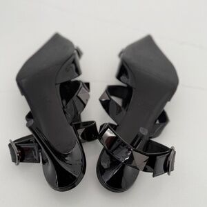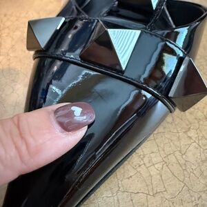They feature a pointed toe and double caged leather straps that are embellished with large signature black pyramid studs along with the trim.