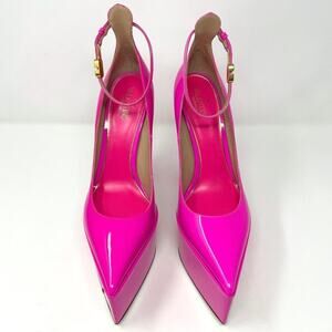 Command the spotlight in these Valentino Garavani VLogo platform pumps, a bold statement piece from the Fall/Winter 2022 collection famously worn by Gigi Hadid on the runway. Crafted in vibrant hot pink patent leather, they feature a sharp pointed toe, sky-high platform, and a towering block heel that channels retro glam with a modern edge. A slim ankle strap with the signature gold VLogo buckle adds a secure fit and a designer finish.