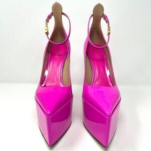 Valentino VLogo platforms, Valentino hot pink pumps, Valentino Fall 2022 heels, Gigi Hadid runway shoes, pink patent platform pumps, designer party heels, statement pumps, Italian luxury shoes, Valentino Garavani size 38, celebrity style Valentino, Mary Jane Platform pumps.