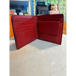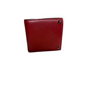 Buffed leather bifold wallet in red. Signature studs and black trim throughout. Embossed logo at back face. Card slots, note slots, and embossed logo at interior. Textile lining in black. Gunmetal-tone hardware. Tonal stitching. Approx. 4.25 length x 3.75 height. Part of the Valentino Garavani collection.