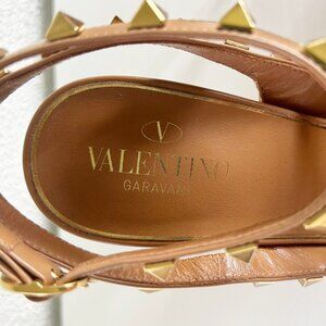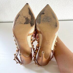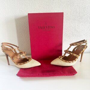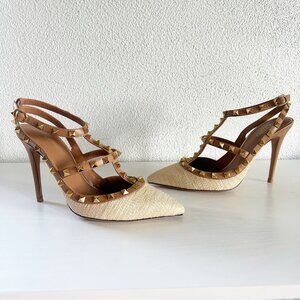 Valentino Garavani Rockstud Brown Leather Raffia Strappy Caged Heels Size EU 38.5 Elevate your warm-weather style with these stunning Valentino Garavani Rockstud heels, blending classic craftsmanship with iconic edge. Crafted from rich brown leather with a textured beige raffia toe box, these strappy heels are adorned with the brand’s signature gold-tone rockstuds for a bold yet sophisticated look. Strappy design with adjustable buckle closure, signature gold rockstud hardware, pointed toe, 4" heel. Perfect for pairing with sundresses, tailored trousers, or resort wear, these heels transition effortlessly from daytime sophistication to evening glamour. Pre owned and authentic. Comes with box and dust bag. Condition: Good pre owned condition. Light scuffing to the toes, one scratch to the bottom of one heel. Normal wear to soles.