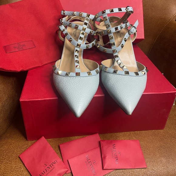 Valentino, Garavani, Rockstud, Caged, Heels, Stiletto, Light blue, Pastel, Studs, Size 42, EU 42, US 12, Leather, Luxury, Designer, Elegant, Party, Formal, Women's shoes, Made in Italy, Authenticity card.