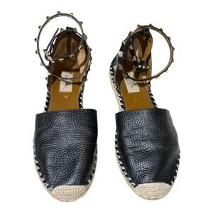 Valentino Garavani Rockstud Double Flat Black Leather Espadrilles Size 38 8