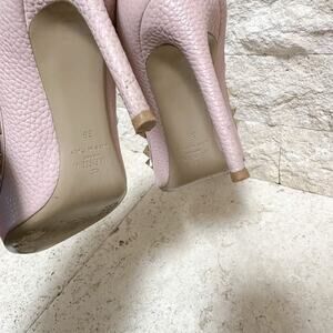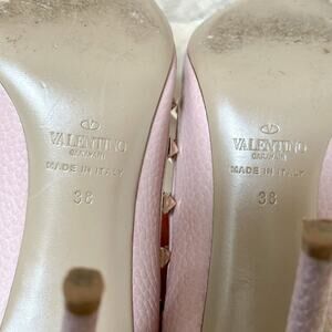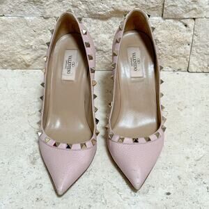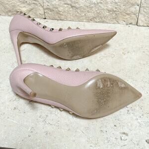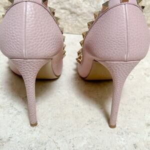 Valentino Garavani Rockstud Grainy Leather 100mm Pump in Water Rose. Size 8 / EU 38. Features platinum-finish rockstuds, lightly padded insole, leather sole, slim stiletto 4" heel, pointed toes, powder grainy leather. Great gently loved condition, scuffs and markings on points, wear on heels and soles as photographed. Plenty of life left. Comes with dust bag and box.
