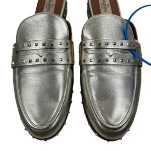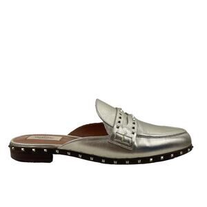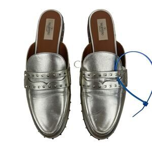 Valentino Garavani Rockstud Metallic Leather Mules Agento Gold Size 40.5
