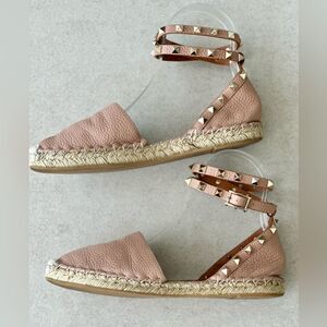 Valentino Garavani Rockstud Pink Leather Espadrille Ankle Wrap Flats Size 37