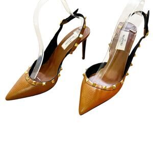 Valentino Garavani Rockstud Slingback Heels Brown Leather Gold Stud Pumps 39.5