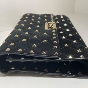 Looking for the ultimate statement bag for Fall/Autumn? This Valentino Rockstud Spike WOC in luxurious black velvet with gold studs is IT. The gold chain lets you wear it crossbody, on the shoulder, or remove it and carry as a glam clutch. Perfect for weddings, nights out, or when you just want to turn heads.