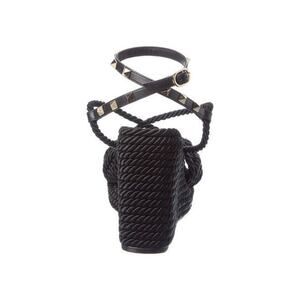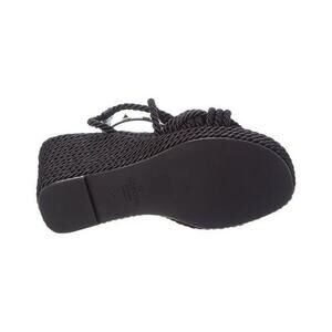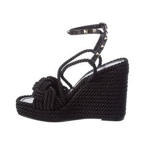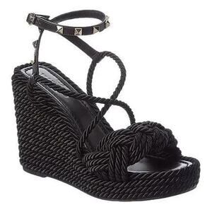 Featuring a woven rope wedge heel, open toe, adjustable ankle strap with buckle closure, and platinum-finish Rockstud embellishments. Designed with a lightly padded leather insole and man-made sole. Heel height: 4.75". Platform: 1". Made in Spain. Fits small