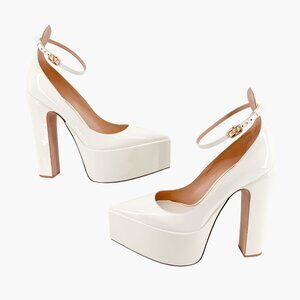 Step into glamour with these Valentino pumps in glossy white patent leather. Featuring a pointed toe and a chunky platform, these block heel pumps are elevated by an ankle strap adorned with the iconic gold-tone Vlogo. A leather footbed and lining ensure lasting comfort, while the leather outsole adds sophistication. Perfect for weddings, evening events, or when you want a statement-making finish to your look.