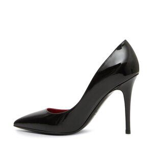 An abbreviated logo makes a bold statement on a sleek, pointy-toe pump designed to take you everywhere.