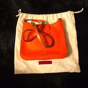 Valentino Garavani VSLING Crossbody Bag, in a vibrant orange leather. This stylish bag features the iconic VSLING magnetic closure in gold-tone hardware, providing a luxurious touch. The interior is lined and includes a zippered pocket, maintaining organization for your essentials. Comes with its original dust bag. Excellent condition with slight visible wear on logo.