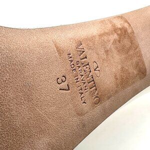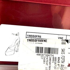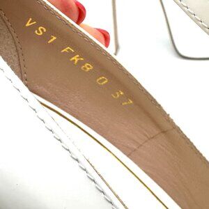 Elegant white platform heels. Features ankle strap with logo detail. Sleek and stylish design.