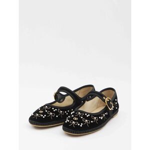 Black velvet ballet flat with metallic thread embroidery and synthetic pearls in a bow motif. Features an antique brass-finish VLogo Signature on the toe and an adjustable strap with buckle. Grosgrain lining. Dust bag included.<br>Size ITA.<BR />Size nationality: IT