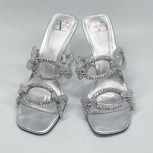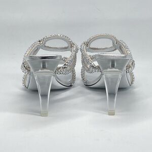 Silver-tone silk blend/lambskin/calf leather metallic finish double-strap design 3D detailing crystal embellishment open toe branded insole transparent block heel slip-on style