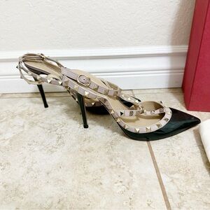 With meticulous craftsmanship and glamorous details, this Valentino pair of pumps reflects the brand's expertise in creating innovative and admirable designs. The Rockstuds elegantly outlines the upper straps and make it undeniably chic. Created from leather, its pointed toes and 10.5cm heels will elongate your appearance. Do come with box and dustbag