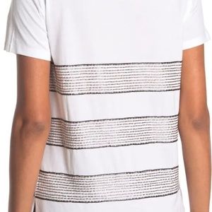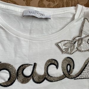 Authentic Valentino designer wear. Spread the message of Peace with this beautifully beaded peace and dove design t-shirt. Approx. 24” inch length, crew neck, short sleeve, jersey knit, construction, 100% cotton. Size OS , fits like a S/M