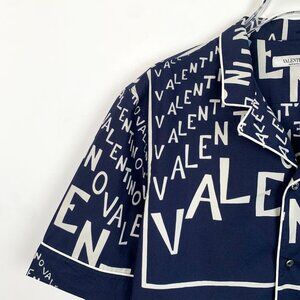This Valentino shirt showcases a bold logo print in contrasting navy and white, crafted from quality cotton. Designed for those who appreciate luxury fashion, it offers a statement look while maintaining a classic shirt silhouette. A versatile piece that enhances both casual and formal attire.