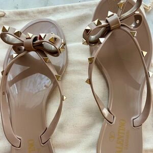 Elegant Valentino sandals in nude. Adorned with gold studs on the bow.. Never worn.