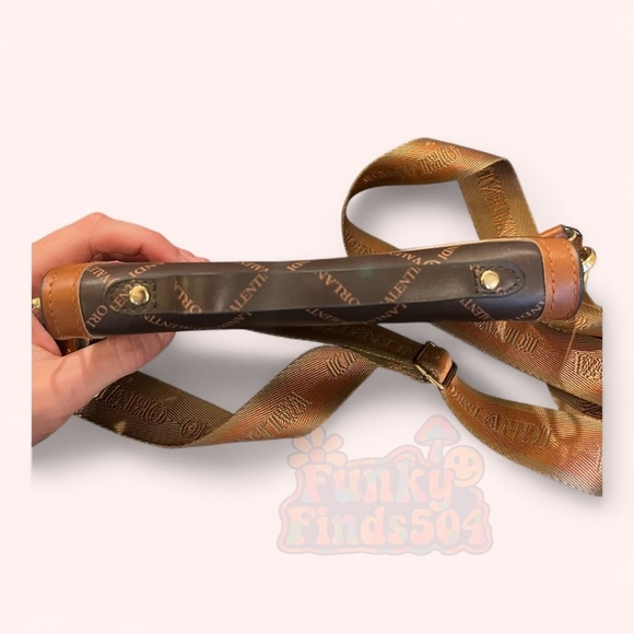 Sleek and versatile Valentino Orlandi crossbody that doubles as a wallet. Features rich brown logo print, tan trim, gold V emblem with crest, and adjustable logo strap. Compact yet roomy—perfect for errands, travel, or everyday chic. Pre-loved in great condition!