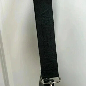 This is a small black and white crossbody shoulder bag designed by Valentino Orlandi in Italy. It features a zip closure, silver-plate hardware, and a crossbody strap handle. This bag comes with black fabric-lined interior. The exterior is made of faux leather with a matte finish. The bag is part of Valentino VLogo product line and is designed in Italy.