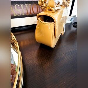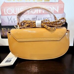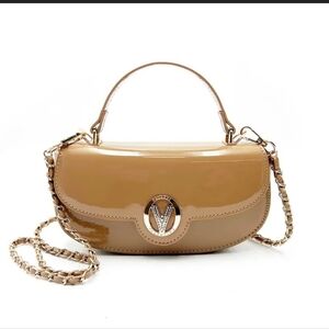 Valentino Orlandi handbag with top handle Elevate your style with this chic V-Logo handbag crossbody strap bag. Perfect for any occasion, this bag combines elegance with functionality. Gold hardware vegan leather color is Taupe. 8.5"W 4.5" H 2.5"D