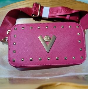 Chic pink crossbody bag by Valentino. Adorned with gold studs and logo. Stylish and versatile.