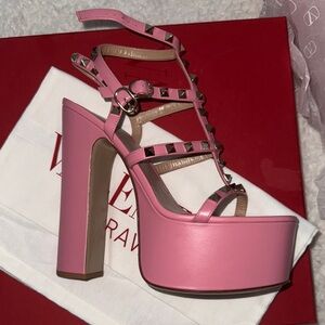 Step out in style with these stunning pink platform heels from Valentino. Featuring a bold design with studded accents, these shoes are perfect for making a statement. Ideal for a night out or a special occasion.
