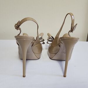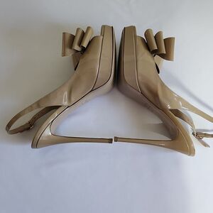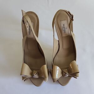 Valentino Platform Nude Patent Leather Peep Toe Sandals, Triple Bow, Sz 9, EUC