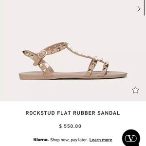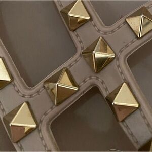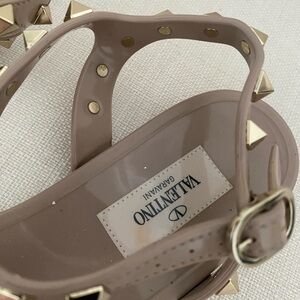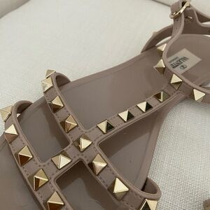 Valentino Garavani sandals in Poudre color (tan/mauve) color. Gold studs, Perfect for any occasion. Very good condition. Rubber material is super durable! Some scratches and wear to soles, but remaining of sandal is good quality. Can be cleaned.