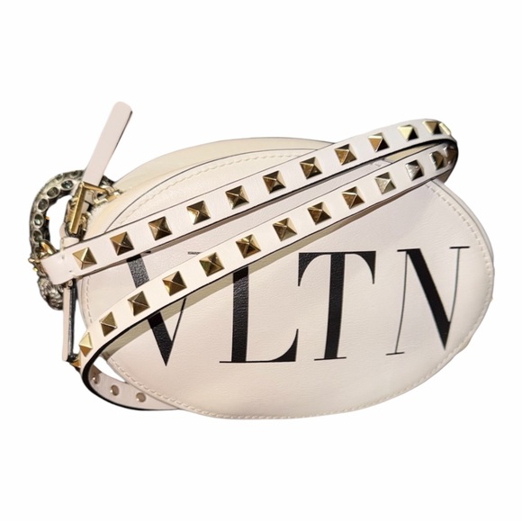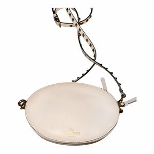 Stylish Valentino crossbody bag. Cream leather with bold gold studs. Features iconic VLTN logo. Perfect for any occasion.